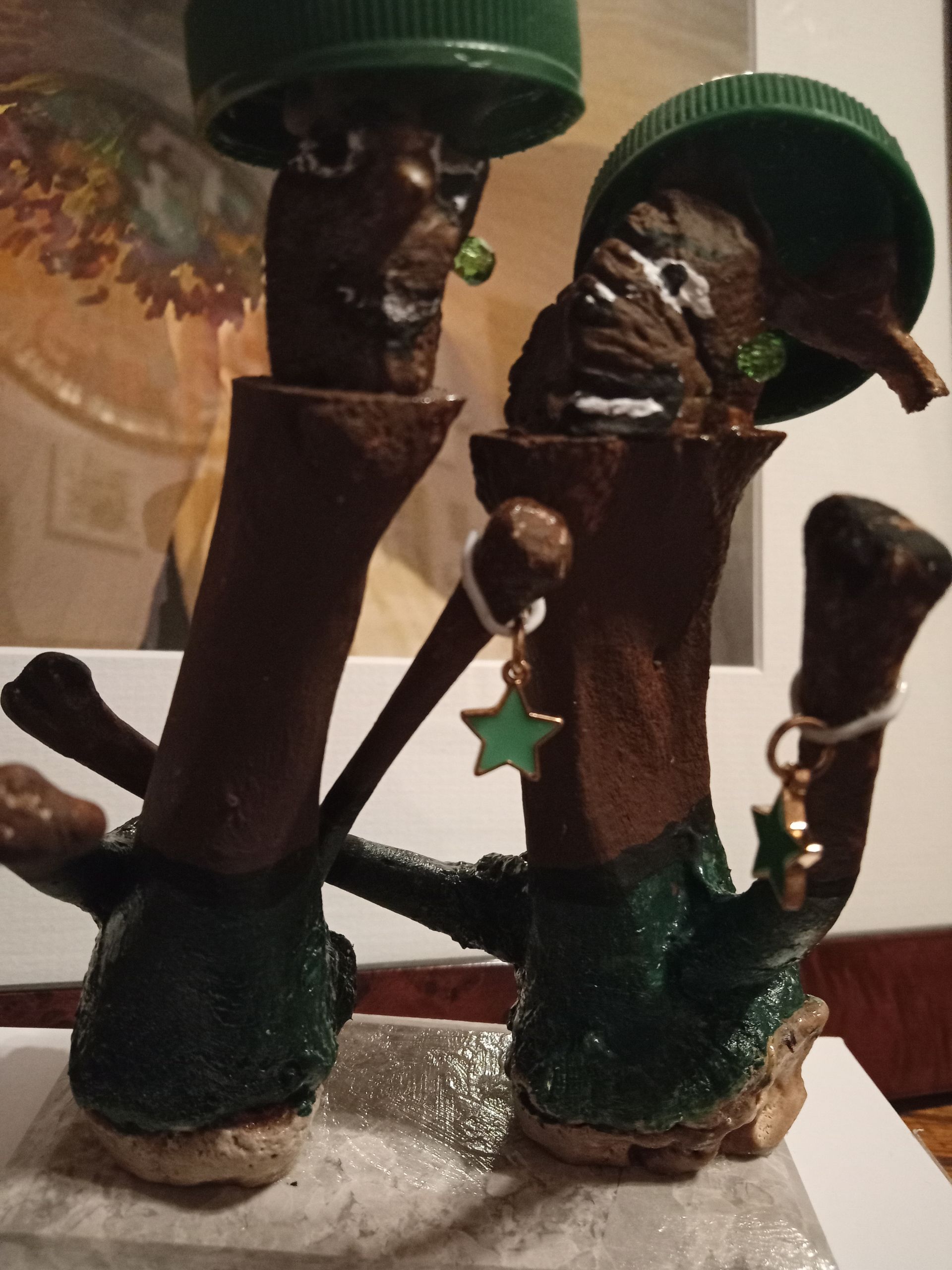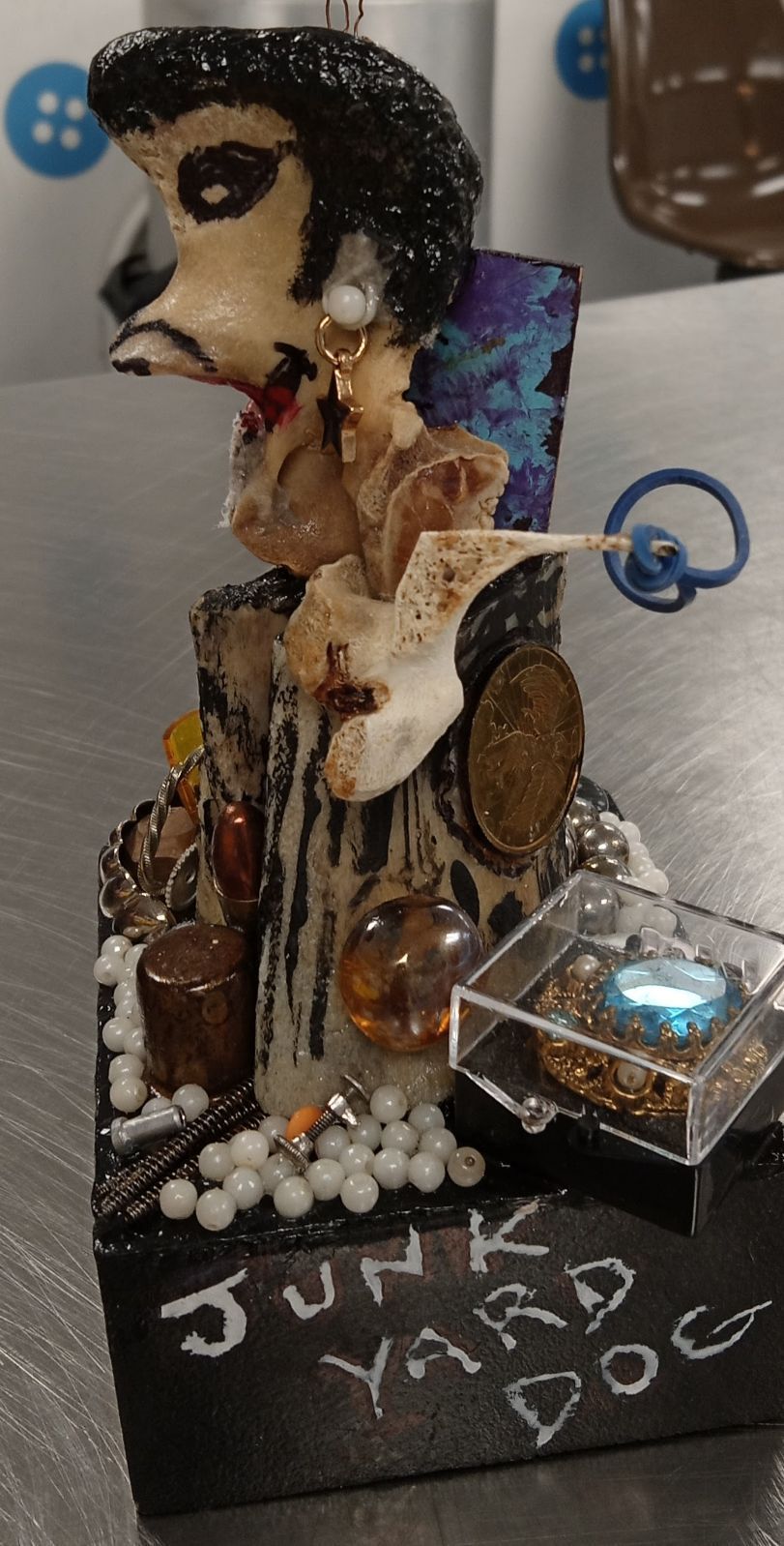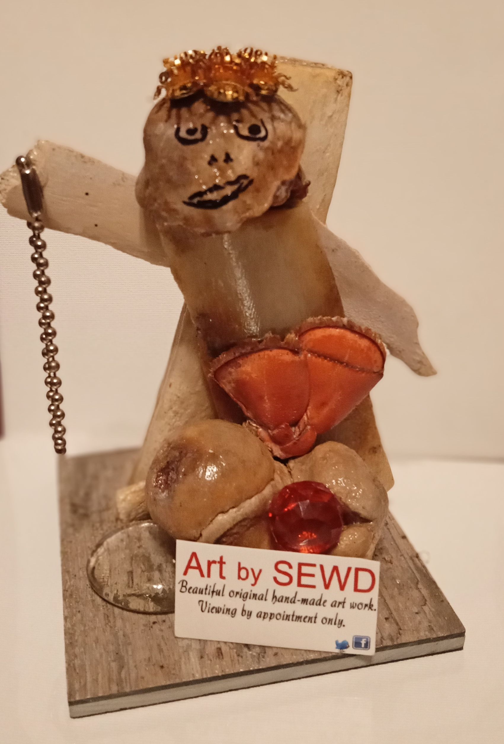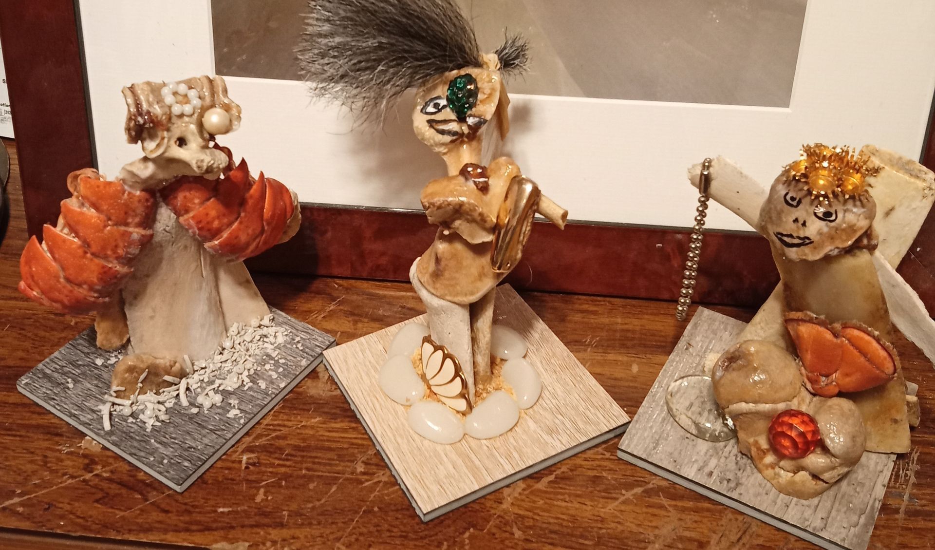 These pieces are made from actual lobster shells, beef short ribs, chicken, pork ribs, and ham bones, etc. I have been experimenting with bones for over ten years now and am still moving forward. Each figure has a name.